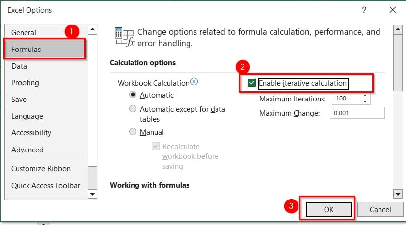 - Enable Iteration: Go to “File” > “Options” > “Formulas“. Check the “Enable iterative calculation” option, and set the maximum number of iterations and maximum change that you want to allow OK.
